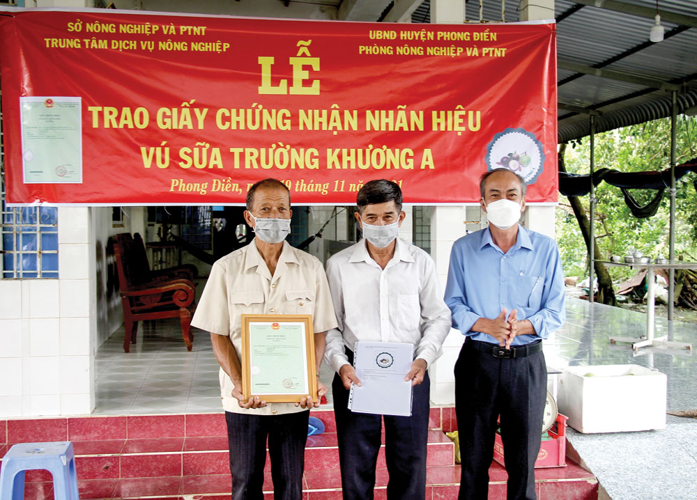 Hợp tác xã Vườn cây ăn trái Trường Khương A, xã Trường Long, huyện Phong Ðiền vào mùa thu hoạch. Hòa cùng với tiếng cười nói rộn rã, không khí tất bật, bà con xã viên tranh thủ khoe với tôi chuyện hợp tác xã vừa đón nhận giấy chứng nhận nhãn hiệu vú sữa Trường Khương A do Cục Sở hữu trí tuệ, Bộ Khoa học và Công nghệ cấp. Ðây là nỗ lực của cả hợp tác xã trong 2 năm qua. Ông Trần Văn Chiến, Giám đốc Hợp tác xã Vườn cây ăn trái Trường Khương A, khoe: “Thổ nhưỡng nơi đây thích hợp trồng vú sữa. Vì vậy mà vú sữa Trường Khương A trở thành trái cây đặc sản, có hương vị riêng không lẫn vào đâu được. Do dịch COVID-19, bà con hợp tác xã rất lo lắng về đầu ra của trái vú sữa. Nhưng nhờ được trồng theo quy trình VietGAP, làm ăn uy tín nhiều năm nên khách hàng vẫn tin dùng. Mặt khác vú sữa của chúng tôi còn được cấp mã số vùng trồng nên vẫn duy trì xuất khẩu được sang thị trường Hoa Kỳ”.