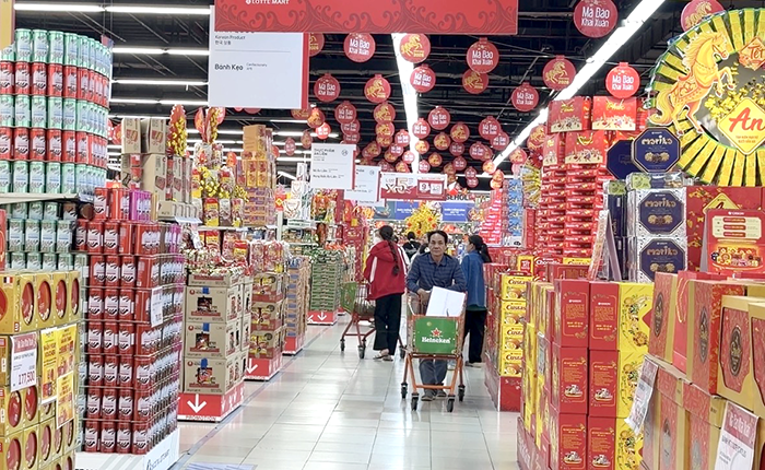 Đến các siêu thị những ngày này, người tiêu dùng không chỉ cảm nhận không khí sôi động qua việc trang hoàng không gian chủ đề Tết, mà tại đây, các siêu thị gia tăng diện tích trưng bày hàng hóa phục vụ Tết từ ngay lối vào, bố trí hàng hóa thuận tiện để người dùng dễ tiếp cận với các biển giá thông tin rõ ràng.