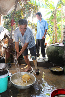 Nguồn nước khoan của gia đình ông Nguyễn Văn Báu thường xuyên bị nhiễm phèn và hôi bùn. |