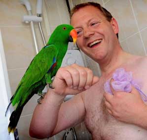 Do quá yêu mến những con vẹt nên một người đàn ông 39 tuổi ở Somerset, Anh không thể nào xa rời chúng dù chỉ một phút và luôn mang theo chúng trên vai đi khắp mọi nơi, kể cả lúc tắm. Stuart Romain còn xây riêng cho chúng một căn phòng trong ngôi nhà của mình. Sở thích đặc biệt của Romain được di truyền từ người cha thích sưu tầm động vật.