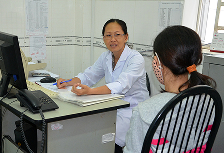 Bác sĩ Tuyết Mai thăm hỏi sức khỏe bệnh nhân. Ảnh: H. HOA