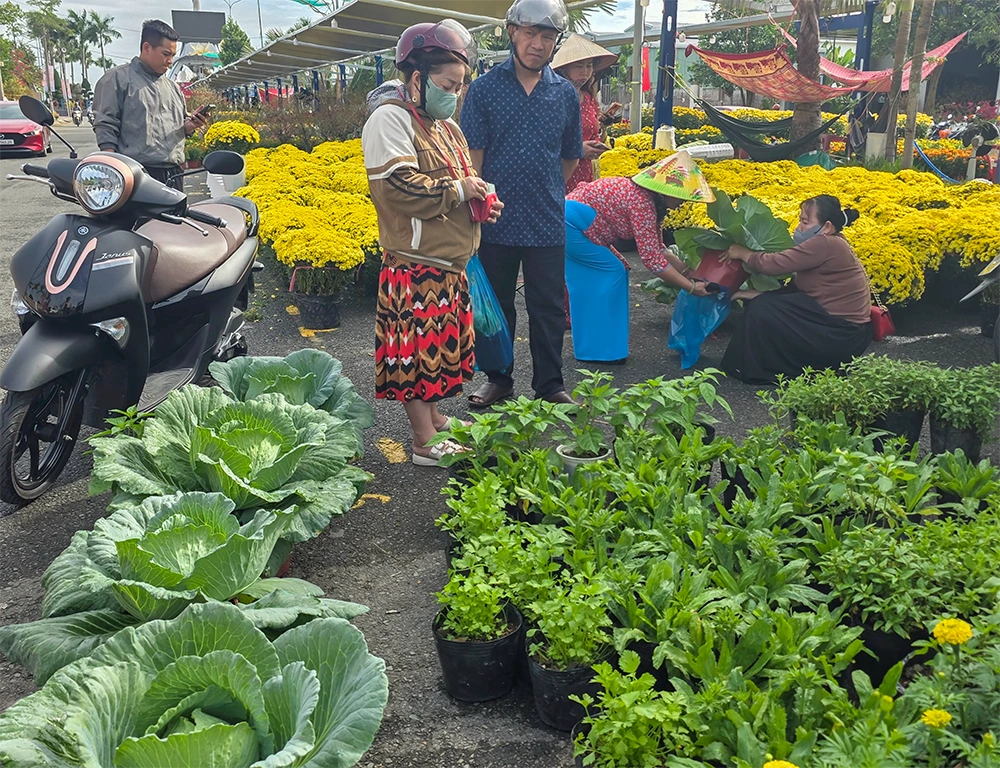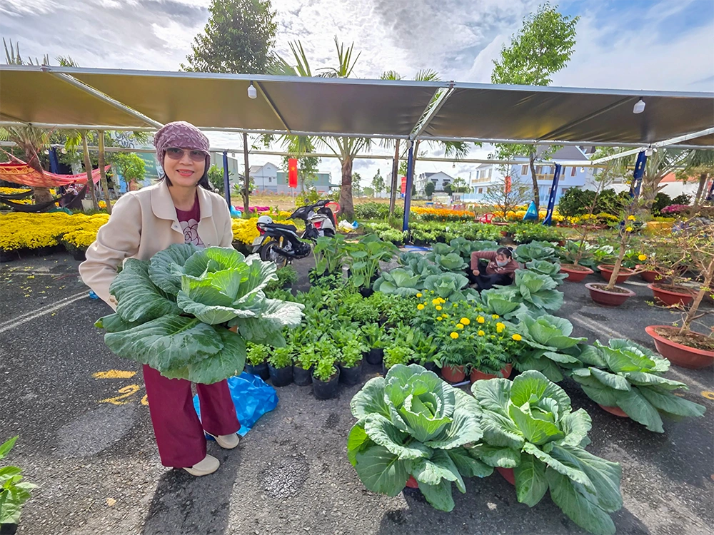 Anh Đỗ Văn Toàn, ngụ khu vực Thạnh Lợi, phường Hưng Phú, bán hoa kiểng Tết tại Chợ hoa Xuân Bính Ngọ năm 2026 tại đường Mai Chí Thọ, phường Hưng Phú, cho biết: “Bên cạnh trồng các loại cúc và vạn thọ, gia đình tôi còn trồng bắp cải, ớt và nhiều loại rau ăn lá trong chậu để làm kiểng bán Tết. Các mặt hàng rau màu này giá chỉ 30.000-50.000 đồng/chậu và được bán khá chạy, nhất là cây bắp cải trồng trong chậu kiểng”.