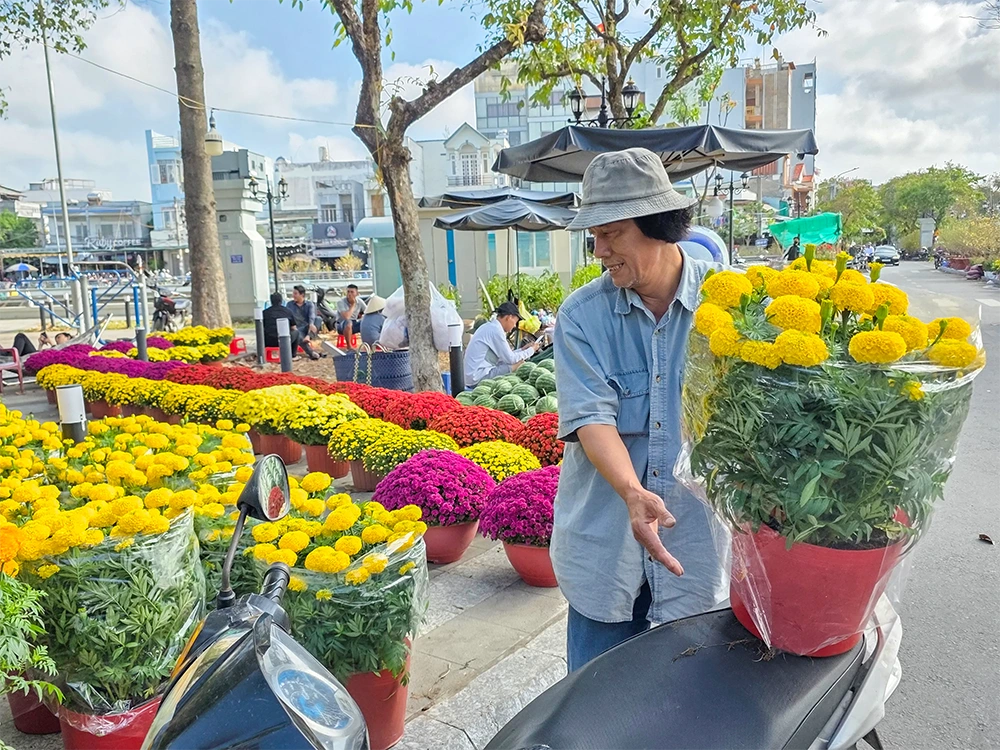 Anh Lê Huy Hoàng ngụ phường Hưng Phú, đang bán hoa kiểng tại đường Hoàng Văn Thụ, phường Ninh Kiều, TP Cần Thơ, cho biết: “Tôi đưa cúc mâm xôi, cúc pico và cát tường ra bán từ 19 tháng Chạp. Năm nay, giá bán các loại hoa giảm đáng kể, đặc biệt cúc mâm xôi giảm hơn 30% so với năm trước. Tuy nhiên, nhiều người đến chợ hoa chủ yếu để tham quan, ngắm hoa, chụp hình và thăm dò giá cả. Do hoa tự trồng và muốn bán mau hết nên cúc mâm xôi tôi bán khá rẻ, chỉ 300.000 đồng/cặp, còn cúc Pico và cát tường là 120.000-150.000 đồng/cặp”.