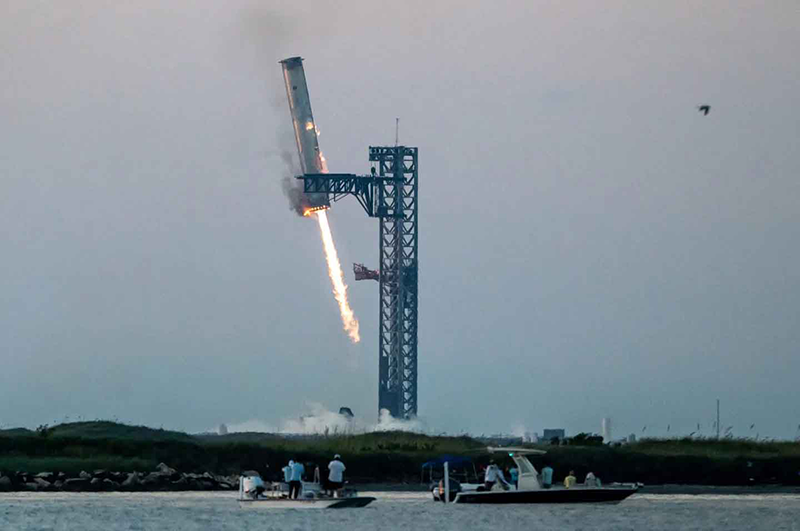 Vài phút sau khi rời bãi phóng ở phía Nam bang Texas của Mỹ, tầng đẩy Super Heavy đã hạ cánh chính xác ở tháp phóng và được cánh tay robot giữ lại. Âm thanh do tầng đẩy phát ra, có thể được nghe thấy tại một điểm nghỉ dưỡng ở cách xa hàng km, lớn như tiếng súng ở cự ly gần, theo nghiên cứu được công bố trên tạp chí JASA Express Letters.