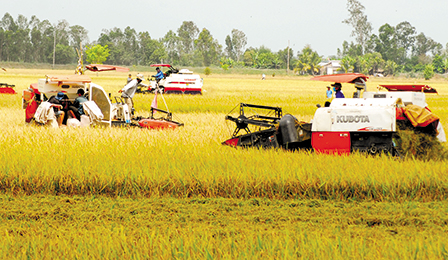 Lúa gạo là mặt hàng thế mạnh của vùng ĐBSCL, nhưng chuỗi giá trị ngành hàng chưa cao. Trong ảnh: Thu hoạch lúa trong cánh đồng lớn tại huyện Cái Bè, tỉnh Tiền Giang. Ảnh: K. CA