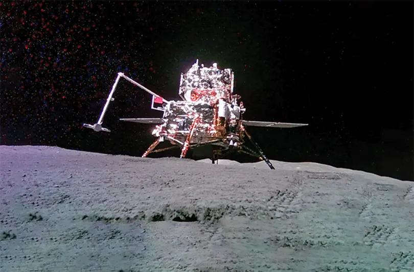Tàu Hằng Nga 6 treo quốc kỳ Trung Quốc bằng cánh tay robot tại vùng tối Mặt trăng. Ảnh: WEIBO
