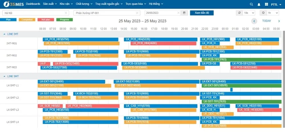 - Giám sát tiến độ sản xuất: MES cập nhật liên tục trạng thái từng lệnh sản xuất, từng công đoạn, máy móc tại hiện trường giúp nhà quản lý nắm bắt nhanh tình trạng hoàn thành các đơn hàng để có phương án ứng phó kịp thời.
