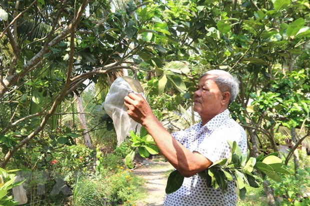 Ông Kim Ruône, Bí thư chi bộ ấp Bót Chếch, xã Lương Hòa, huyện Châu Thành là người có uy tín vùng đồng bào dân tộc Khmer chăm sóc vườn cây ăn trái của gia đình. (Ảnh: Thanh Hòa/TTXVN)