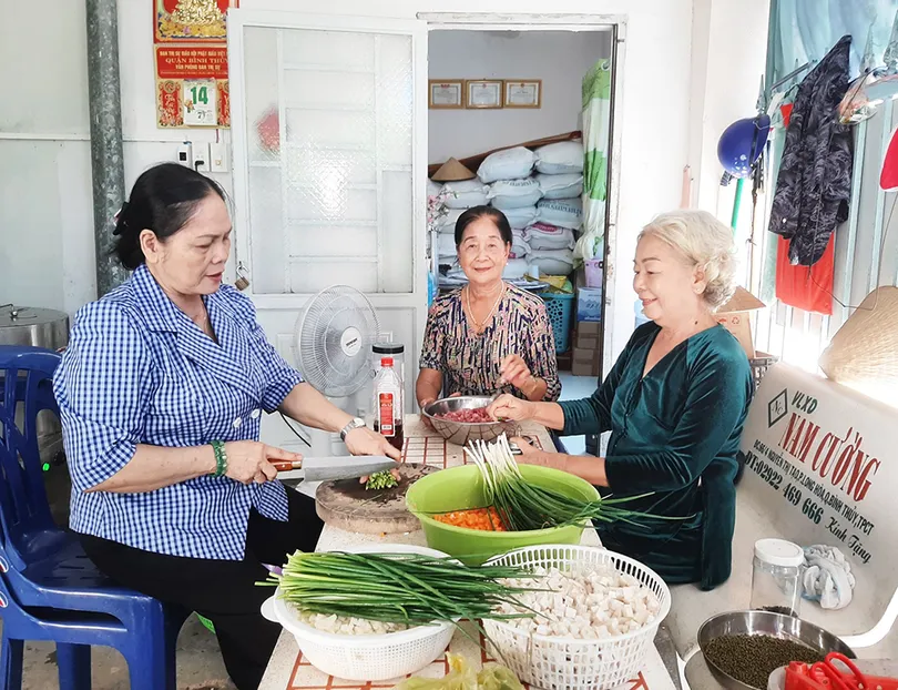 Cô Nguyễn Kim Chính (giữa) cùng các nhà hảo tâm chuẩn bị nguyên liệu nấu cháo phục vụ người dân.