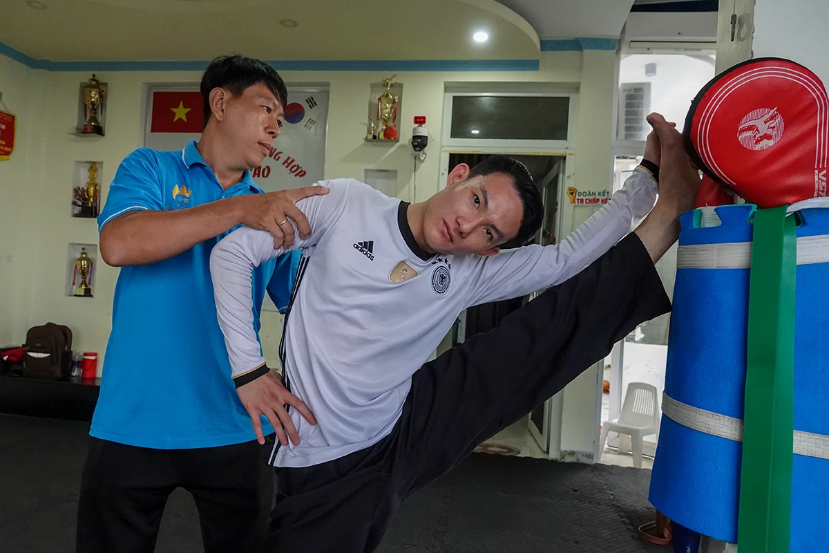 Anh Bảo hỗ trợ Hiếu tập luyện.