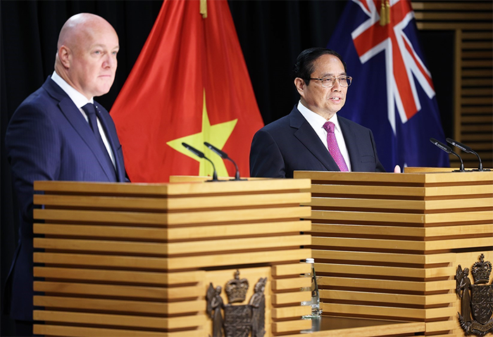 Trước quan chức hai nước, các phóng viên Việt Nam, New Zealand và quốc tế, Thủ tướng Christopher Luxon và Thủ tướng Phạm Minh Chính cho biết, hai Thủ tướng vừa có cuộc hội đàm rất dân chủ, sôi nổi, thành công đặc biệt, hai bên nhất trí thúc đẩy hợp tác trên tất cả các lĩnh vực, hướng tới nâng cấp quan hệ hai nước lên tầm cao mới.