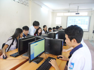 Giáo viên Trường THPT Phan Ngọc Hiển hướng dẫn học sinh thực hành môn tin học. |