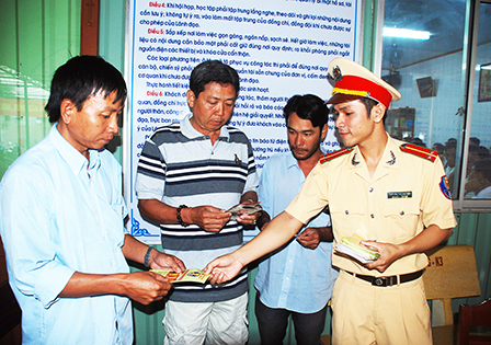 CSGT Phòng PC67, thuộc Công an TP Cần Thơ phát tờ rơi tuyên truyền Luật Giao thông đường bộ cho chủ doanh nghiệp vận tải và các lái xe trên địa bàn thành phố. Ảnh: X. ĐÀO
