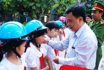 Ông Nguyễn Hữu Nhân, Trưởng Phòng công tác học sinh- sinh viên, thuộc Sở GD-ĐT TP Cần Thơ trao MBH cho học sinh Trường Tiểu học Ngô Quyền. Ảnh: X.ĐÀO |