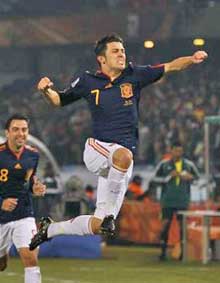 Niềm phấn khích của David Villa sau ghi ghi bàn mở tỷ số cho Tây Ban Nha. Ảnh: AP |