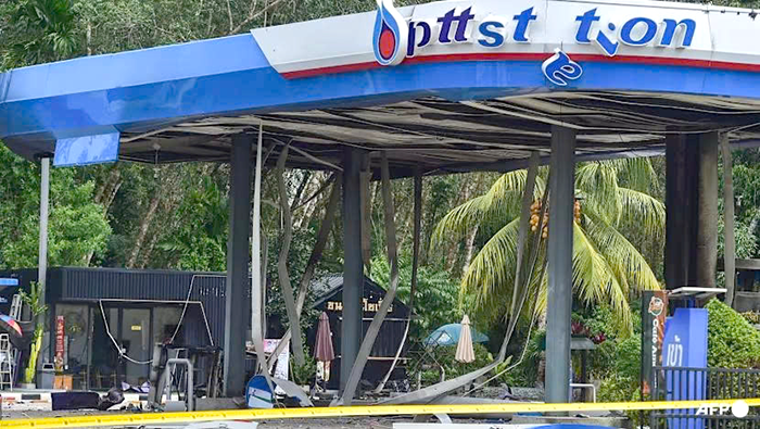 Một trạm xăng ở tỉnh Narathiwat tan hoang sau vụ nổ bom ngày 11-1. Ảnh: AFP