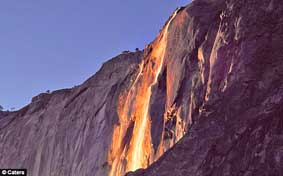 Đây không phải là cảnh núi lửa đang phun trào mà là một hiện tượng thiên nhiên hoàn toàn khác: hoàng hôn bên ngọn thác. Tấm ảnh được chụp tại Thác Horsetail trong Vườn quốc gia Yosemite, bang California (Mỹ) này cho thấy khi mặt trời xuống đến đỉnh ngọn thác, ánh hoàng hôn khiến một dòng nước đỏ chói như hổ phách hiện ra, tạo nên cảnh tượng vô cùng bắt mắt. Tác giả bức ảnh này là nhiếp ảnh gia Penny Adams, người đã miệt mài ghi hình các cảnh đẹp nhất ở Mỹ trong suốt 26 năm qua. Anh cho biết sau khi chụp được khoảnh khắc có một không hai này, anh không thể ngủ được vì nóng lòng nhìn thấy bức ảnh được rửa ra.
