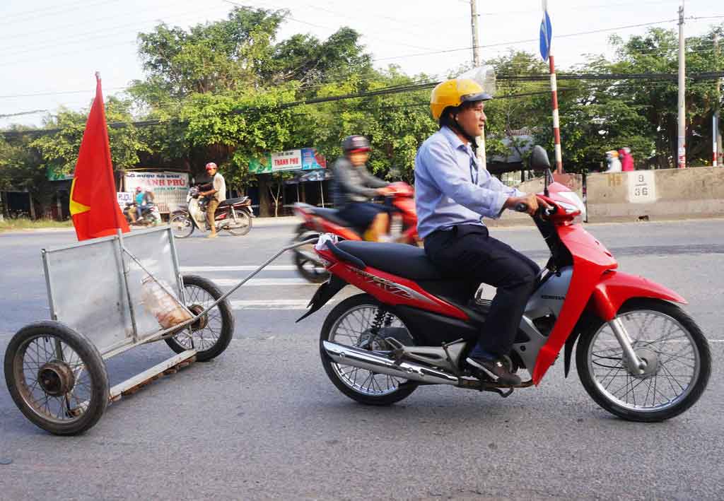 Anh Nguyễn Lê Duy điều khiển xe gắn máy kéo theo xe tự chế đi hút đinh dọc Quốc lộ 1, đoạn qua xã Thạnh Đức, huyện Bến Lức