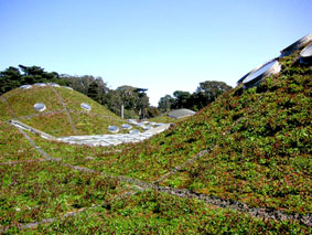 Từ trên cao nhìn xuống, CAS trông rất “mát mắt” bởi mái nhà tươi xanh hệt như thảm cỏ rộng 1 hécta nhấp nhô những ngọn đồi. Mái nhà gồm 1,7 triệu cây đặc hữu ở California này ước tính mỗi năm hấp thu hơn 13,6 triệu lít nước mưa, vừa không lãng phí nguồn nước tự nhiên vừa tạo môi trường sống cho thế giới hoang dã bên dưới. Đứng trên mái nhà, Frank Almeda, người quản lý hệ thực vật của CAS cho biết với thiết kế này, kiến trúc sư Renzo vừa muốn tôn tạo cảnh quan vừa làm nơi để khách tham quan lướt nhìn bảo tàng bên dưới.
