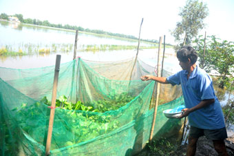 Ông Bùi Văn Chỉnh ở ấp Tân Hưng Tây là người thành công từ mô hình nuôi cá lóc mùa lũ. |