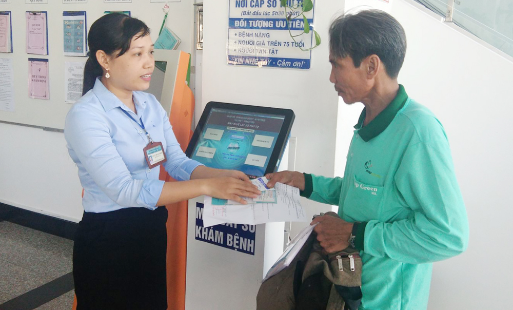 Cán bộ điều dưỡng BV tiếp đón, hướng dẫn bệnh nhân quy trình khám chữa bệnh.
