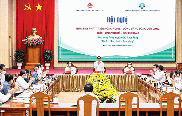 (TTXVN) - Sáng 6-3, tại tỉnh Kiên Giang, Thủ tướng Chính phủ Phạm Minh Chính dự, chủ trì hội nghị về thúc đẩy phát triển nông nghiệp ÐBSCL chủ động thích ứng với biến đổi khí hậu, với chủ đề “Khát vọng nông nghiệp Ðất Chín Rồng xanh - sinh thái - bền vững”, do Bộ Nông nghiệp và Phát triển nông thôn cùng UBND của 13 tỉnh, thành phố vùng ÐBSCL phối hợp tổ chức. Cùng dự có lãnh đạo các các bộ, ban, ngành Trung ương; lãnh đạo các tỉnh, thành phố khu vực ÐBSCL.