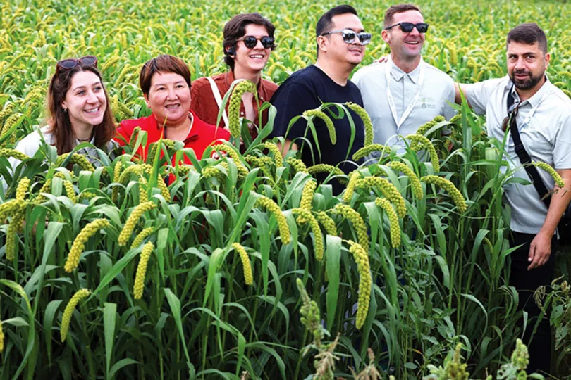 Các chuyên gia quốc tế tham quan cánh đồng kê ở huyện Linh Khâu. Ảnh: China Daily
