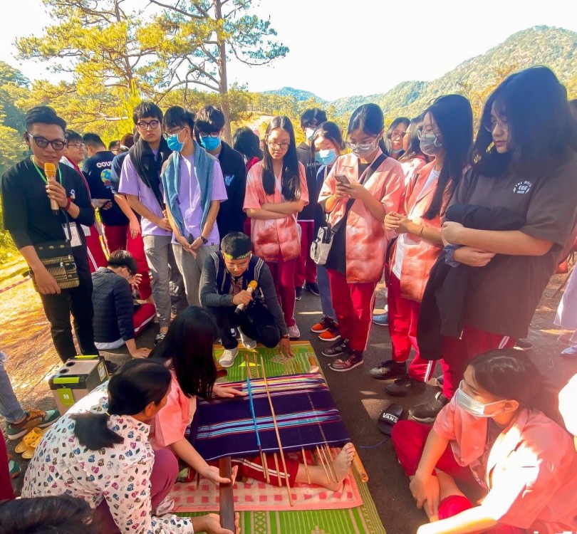 Học sinh trải nghiệm dệt thổ cẩm và tìm hiểu hoa văn thổ cẩm cùng Ethinicity trong chương trình kết hợp với Hải Âu Tourist. Ảnh: Hải Âu Tourist