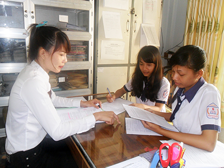 Cán bộ Trường Phổ thông Dân tộc Nội trú TP Cần Thơ hướng dẫn học sinh điền thông tin vào Phiếu ĐKDT.