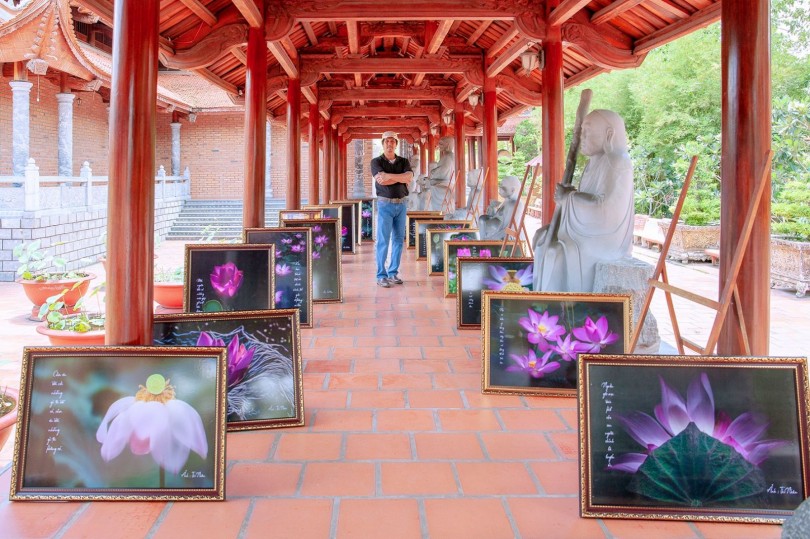 Nghệ sĩ Thi Nhân bên các tác phẩm về sen tại Thiền viện Trúc Lâm Phương Nam. Ảnh: NVCC