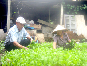 Vợ chồng ông Sửu, bà Tuần chăm sóc vườn rau, cải thiện thu nhập gia đình. |