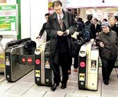 Hành khách ở trạm tàu điện Tokyo bước chân trên tấm áp điện tạo ra điện năng. Ảnh: Getty Images |