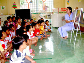 Cô trò Trường Mầm non Thới Đông trong giờ kể chuyện tranh. |