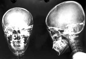Sở dĩ cậu bé may mắn bảo toàn được tính mạng là do mũi tên chệch hướng không trúng vào não bộ. Nếu được bắn với lực mạnh hơn chút nữa, rất có thể mũi tên sẽ xuyên qua ót. Tuy nhiên, các bác sĩ cho biết Liu vẫn còn nguy cơ bị nhiễm trùng và có thể phải trải qua vài lần phẫu thuật nữa. Trong ảnh: Hình chụp X-quang mũi tên ghim vào sọ của Liu.