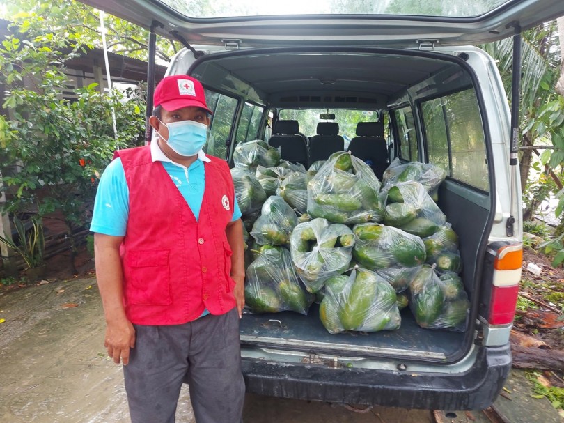 Ông Lê Phúc Hậu, Phó Chủ tịch Hội Chữ thập đỏ huyện Thới Lai, thường xuyên vận động, tặng rau củ quả đến người dân ở khu vực phong tỏa trên địa bàn.