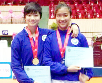 Thu Ngân (trái) nhận HCV tại giải Vô địch karatedo Đông Nam Á. |