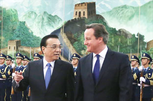 Thủ tướng Anh David Cameron (phải) và người đồng cấp Trung Quốc Lý Khắc Cường trong lễ đón tiếp tại Thủ đô Bắc Kinh hôm 2-12. Ảnh: Getty Image