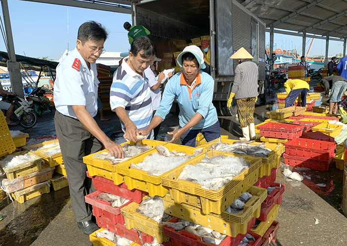 Hải sản khai thác cặp bến được kiểm tra theo quy định tại Cảng cá Trần Đề, TP Cần Thơ.