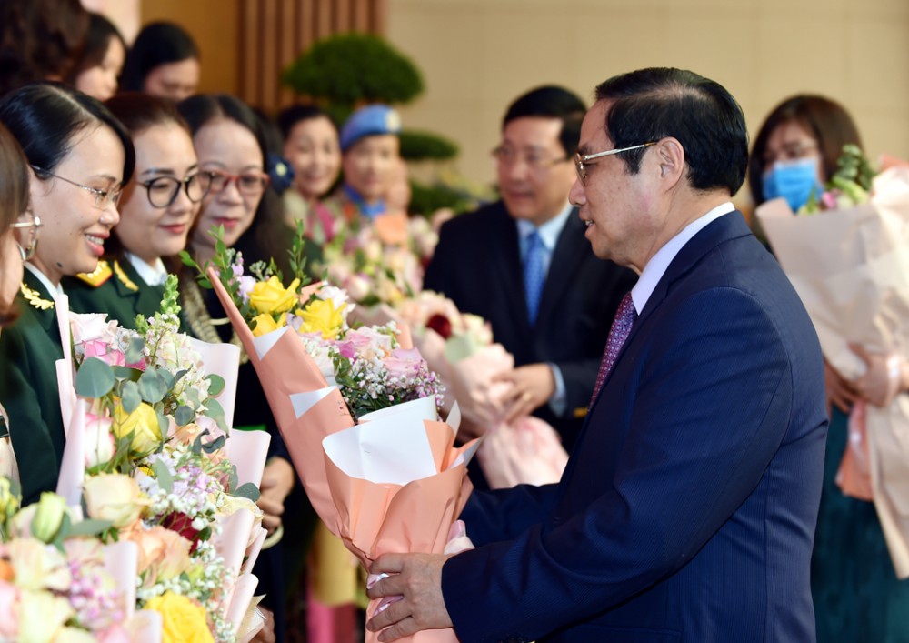 Theo Thủ tướng, truyền thống tốt đẹp đó như mạch nguồn tiếp nối các thế hệ, ngày nay chúng ta cũng chứng kiến dù ở bất cứ hoàn cảnh nào, vị trí công việc gì, phụ nữ Việt Nam cũng tỏa sảng phẩm chất “Anh hùng, bất khuất, trung hậu, đảm đang” như 8 chữ vàng mà Bác Hồ đã dành tặng cho phụ nữ Việt Nam. Đặc biệt, trong suốt hành trình gian nan chống dịch COVID-19, chúng ta đã chứng kiến nhiều tấm gương sáng của chị em phụ nữ tham gia tuyến đầu chống dịch, đối mặt với nhiều hiểm nguy và phải gác lại hạnh phúc, nỗi niềm riêng tư, có chị em đã ra đi mãi mãi.