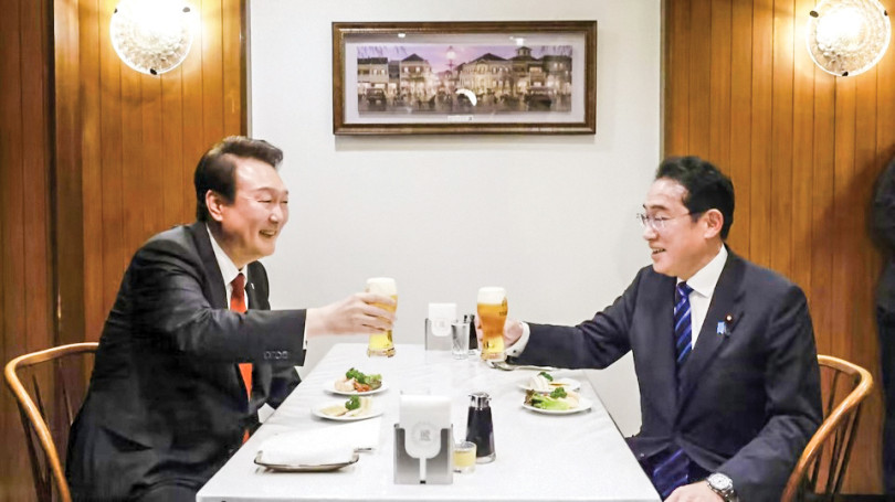 Tổng thống Hàn Quốc Yoon Suk Yeol (trái) và Thủ tướng Nhật Bản Fumio Kishida nâng ly tại cuộc gặp ở Tokyo, tháng 3-2023.