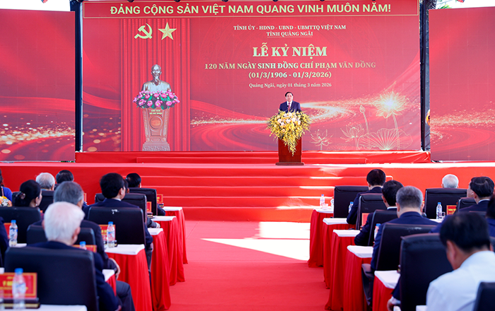 Sáng 1-3, tại xã Mộ Đức, tỉnh Quảng Ngãi; Tỉnh ủy, HĐND, UBND, Ủy ban MTTQVN tỉnh Quảng Ngãi tổ chức Lễ kỷ niệm 120 năm Ngày sinh Thủ tướng Phạm Văn Đồng (1/3/1906-1/3/2026). Thủ tướng Chính phủ Phạm Minh Chính phát biểu tại Lễ kỷ niệm.