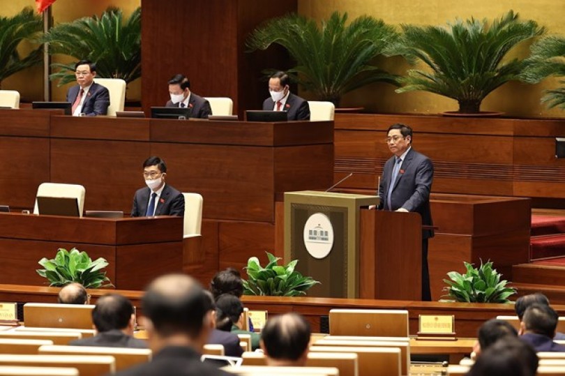 Thủ tướng Phạm Minh Chính trình bày báo cáo kết quả thực hiện kế hoạch phát triển kinh tế-xã hội năm 2021; dự kiến kế hoạch phát triển kinh tế - xã hội năm 2022. Ảnh: TTXVN