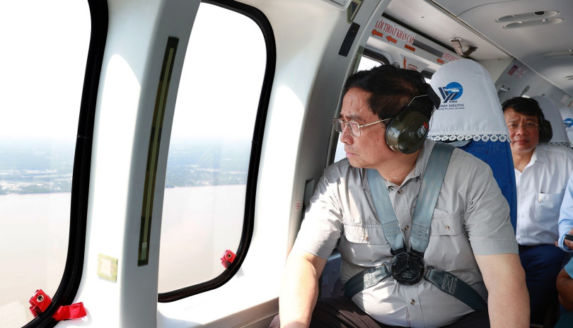 Thủ tướng Phạm Minh Chính thị sát tuyến đường bộ ven biển bằng trực thăng. Ảnh: DƯƠNG GIANG-TTXVN