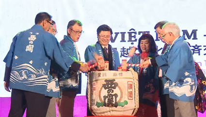 Các đại biểu Việt Nam và Nhật Bản thực hiện nghi thức đập rượu khai mạc chương trình giao lưu văn hóa và thương mại Việt Nam - Nhật Bản tại TP Cần Thơ năm 2015. Ảnh: CTV |