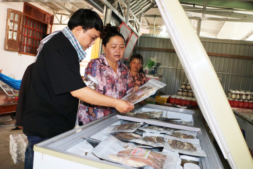 Khách hàng chọn mua sản phẩm OCOP được làm từ cá tra của gia đình ông Chương Văn Khanh ở quận Thốt Nốt, TP Cần Thơ.