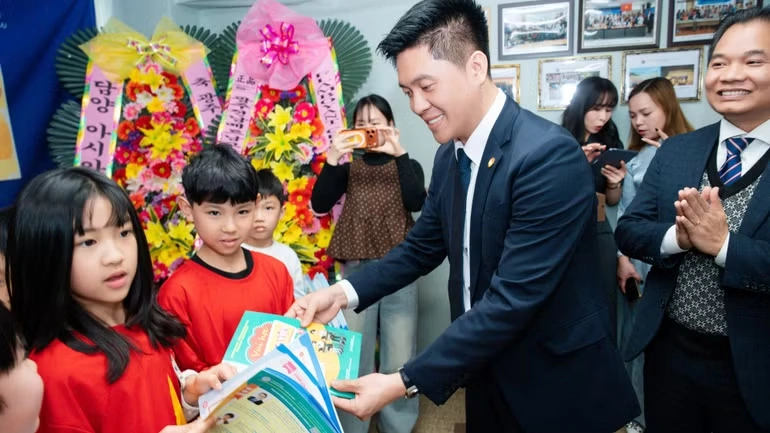 Ông Nguyễn Duy Anh - Ủy viên Ủy ban Trung ương Mặt trận Tổ quốc Việt Nam, Tổng Thư ký Mạng lưới Giảng dạy tiếng Việt và gìn giữ văn hóa Việt Nam toàn cầu trao sách "Vui học tiếng Việt" tặng các em nhỏ người Việt tại Hàn Quốc.