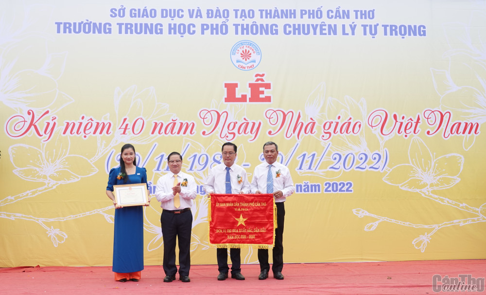 Đến dự và phát biểu tại buổi lễ, ông Trần Việt Trường, Chủ tịch UBND TP Cần Thơ, gửi lời chúc mừng tốt đẹp đến quý thầy cô của Trường THPT chuyên Lý Tự Trọng nói riêng, toàn thành phố nói chung, nhân Ngày 20-11. Chủ tịch UBND thành phố cho biết: Những năm qua, TP Cần Thơ đã triển khai đồng bộ các nhiệm vụ, giải pháp về đổi mới căn bản, toàn diện giáo dục và đào tạo (GD&ĐT). Thành phố đã ban hành nhiều nghị quyết, đề án, chính sách và ưu tiên dành nguồn lực thỏa đáng để đầu tư phát triển sự nghiệp GD&ĐT. Qua đó, ngành GD&ĐT đã đạt được những kết quả đáng trân trọng, góp phần thúc đẩy sự phát triển kinh tế - xã hội của thành phố. Trong thành tích chung của ngành GD&ĐT, Trường THPT chuyên Lý Tự Trọng đóng góp nhiều thành tích về đào tạo nguồn nhân lực chất lượng cao cho thành phố và cả nước.