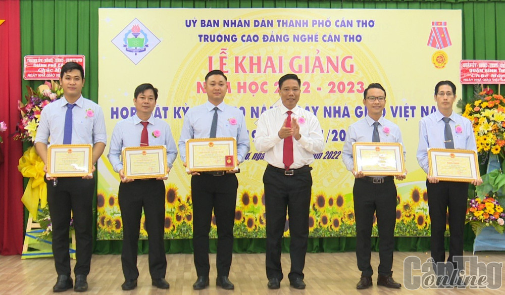 Ông Nguyễn Thực Hiện, Phó Chủ tịch UBND TP Cần Thơ, (thứ ba từ phải qua) trao Bằng khen của UBND thành phố cho các tập thể và cá nhân Trường Cao đẳng Nghề Cần Thơ .Ảnh: Nguyễn Minh