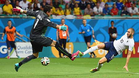 Tuy nhiên, mọi thứ đã thay đổi từ một cú đá cao chân của Giroud, khi mũi giày của anh trúng vào mặt của Von Bergen khiến trung vệ này phải rời sân ở phút 15, người thay thế anh là Philippe Senderos. Thụy Sĩ thiếu đi một “mắc xích” quan trọng trong hệ thống phòng ngự và các cầu thủ Pháp đã khai thác triệt để điểm yếu này. Phút 17, từ quả đá phạt góc của đồng đội, Senderos không thể kèm được Giroud bật cao đánh đầu hiểm hóc. Dù thủ môn Benaglio bay người hết cỡ, tay đã chạm bóng nhưng vẫn không thể cứu thua cho Thụy Sĩ.