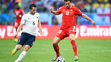 Tiền vệ Cabaye (6) của Pháp đi bóng vượt qua Mehmedi của Thụy Sĩ. Ảnh: FIFA.